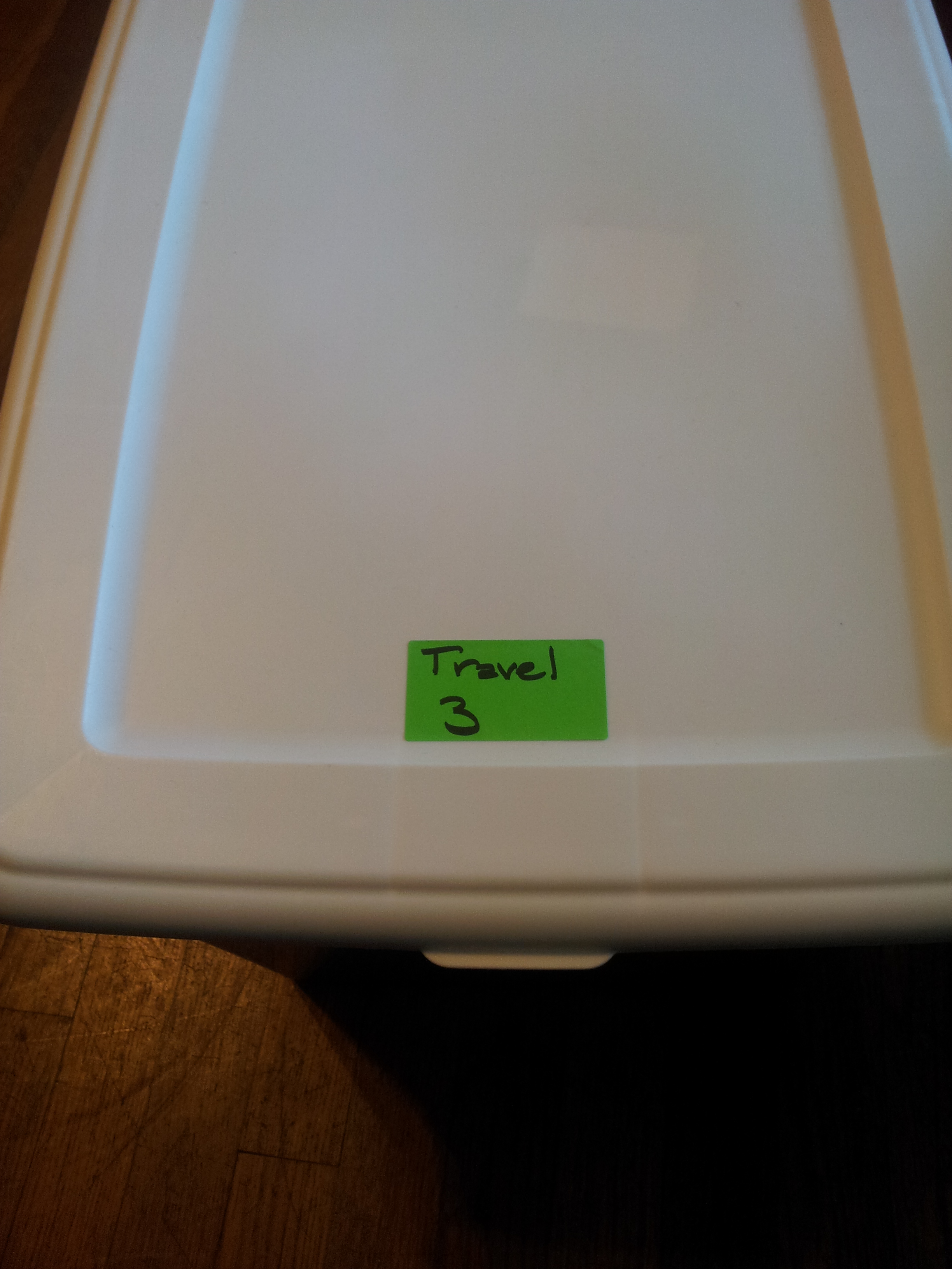 Please note that I not only use florescent labels but I label the category of what is inside and the box number. So when I send my Sweet Son to bring out the boxes…he will know there are 3 travel boxes. I also label on the end and top of each box. π (In case they are in a stack.:) )